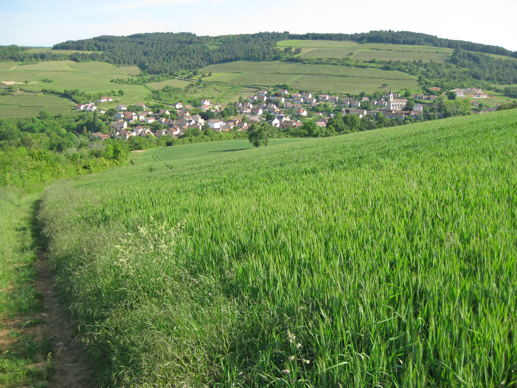 On my way from Pernand-Vergelesses I walked adjacent to a field of rye. It was so quiet that I thought I have heard the flutter of a butterfly's wings. Wow, it is really quiet. Soon the trail turned (south) into thick forest. I eventually reached a junction of two trails (GR76 and "Center Ville") just above Savigny-les-Beaune) at 2:10 (14h10). So far, I had covered 7.87 miles today. I chose the GR76 route and followed it towards the eglise (church). After resting in a shady spot on the east side of the village, I continued on 2 more miles following roads C4, D18, and the Rue Vercots to Aloxe-Corton.