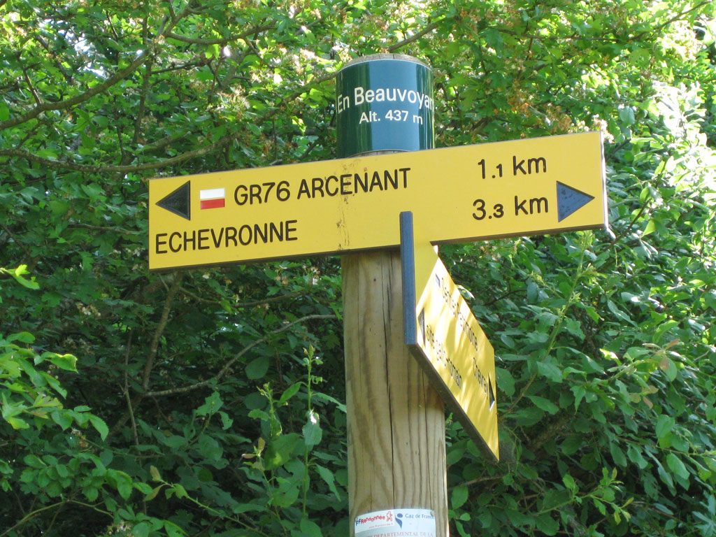 The taxi arrived at 8:30 and took me west to the village of Arcenant. The drive took about 25 minutes and cost 20 euro (including tip). The driver was unsure of the trailhead's location so we searched around a bit. Eventually we found a trail marker (shown below).